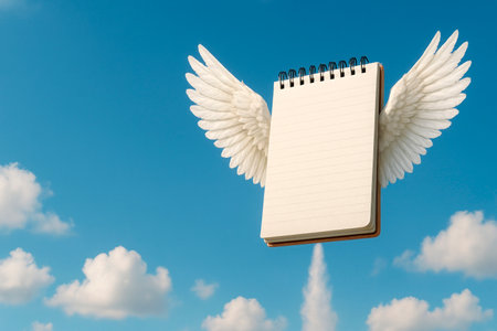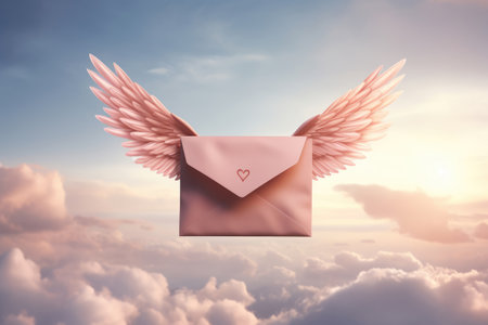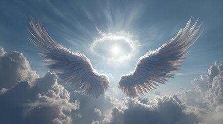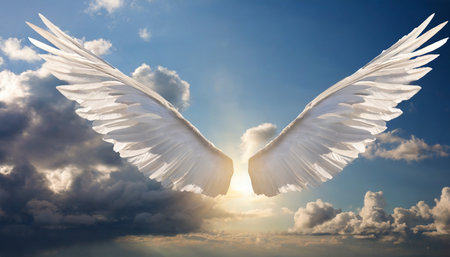 Majestic angel wings spread in a radiant sky above the clouds, divine inspiration.