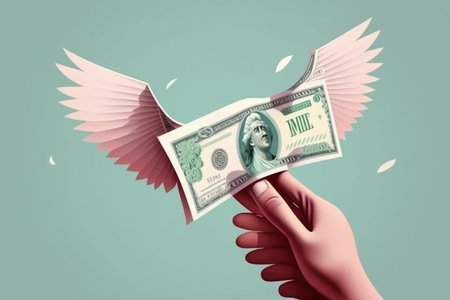 Hand holding dollar bills with wings. Conceptual image of saving money
