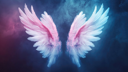 Ethereal angel wings in soft pastel colors glow gently against a dark background, creating a surreal heavenly effect