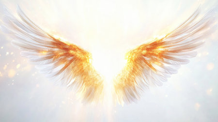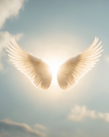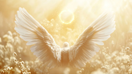 An ethereal scene featuring majestic angel wings illuminated by soft golden light. The dreamlike setting evokes serenity and spirituality, offering a peaceful atmosphere.