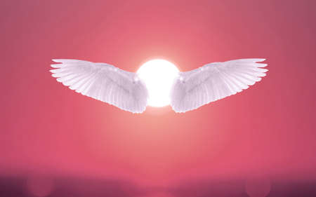 Angel White Wings In front of Sun With Sunset Sky Color. Angelis Wings, spiritual Concept