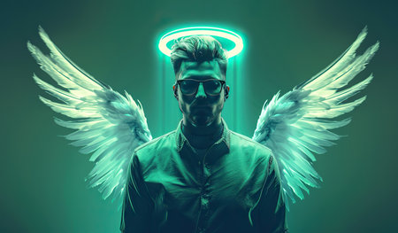 Guardian angel resists the forces of evil. Heavenly light surrounds him.