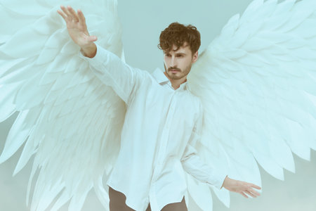 The male guardian angel looks with calm and hope in his eyes. Full-length studio portrait with white background.