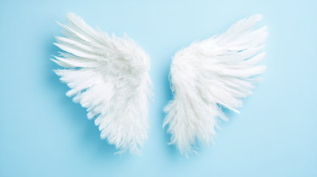 Soft white angel wings resting on a light blue background. Perfect for themes of fantasy, purity, and creativity, these fluffy wings evoke a sense of whimsy and beauty.