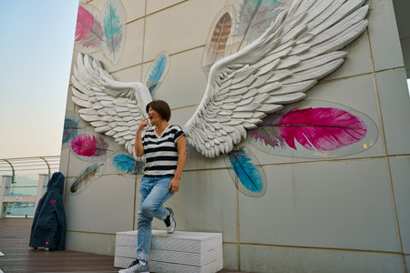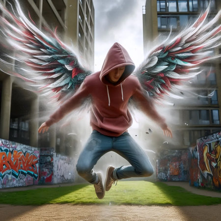 A skateboarder mid-air with graffiti-style angel wings, Ai generated image