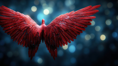 Vibrant red wings spread wide against a dreamy backdrop of shimmering blue lights.