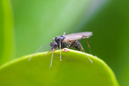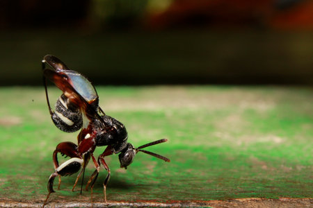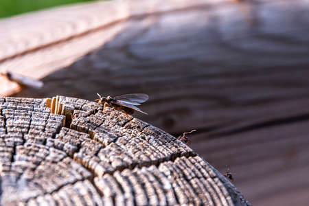 Winged Male Drone Leafcutter ants, macro close up view, dying on beach after mating flight with queen in Puerto Vallarta Mexico. Scientific name Atta mexicana, a species of leaf-cutter ant, a New World ant of the subfamily Myrmicinae of the genus Atta.