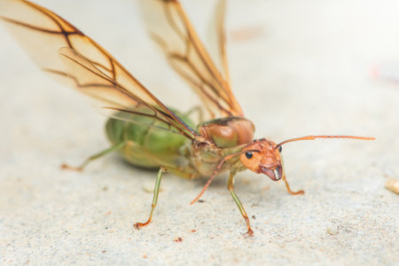 Close up hairy red ant with wings on cement floor, Selective focus.