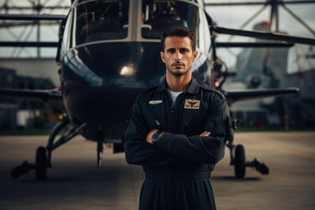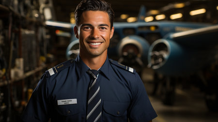 Confident male pilot in front of an airplane, epitomizing professionalism in aviation.