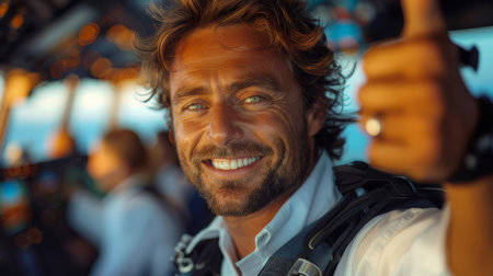 Confident male pilot smiling inside an aircraft cockpit, giving a thumbs up gesture. Captures a sense of satisfaction, professionalism, and readiness for flight.