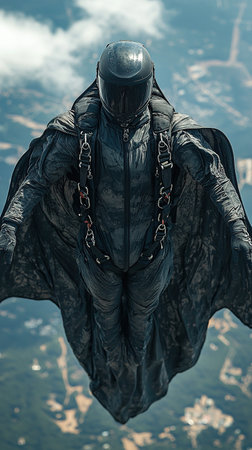 A wingsuiter soars through the sky, showcasing the daring sport of human flight against a backdrop of blurred landscape below.