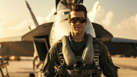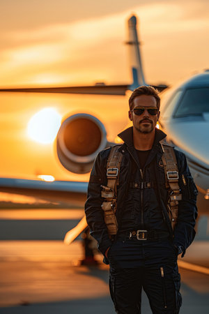 Confident pilot standing in front of a private jet, sunset background