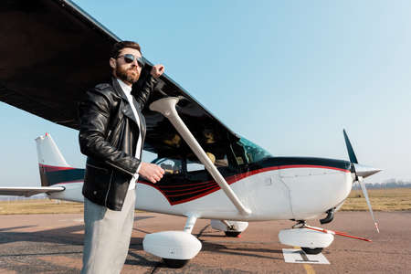 bearded pilot in sunglasses and leather jacket standing near aircraft wing