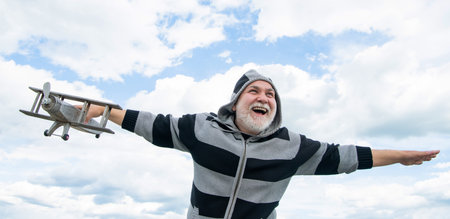 excited senior man on sky background. senior man at retirement. senior retired man with toy plane