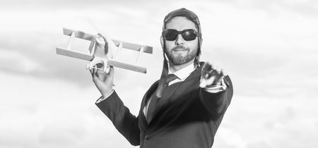 business person in suit and pilot hat launch plane toy on sky background
