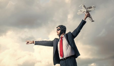 ambitious businessman in suit and pilot hat launch plane toy