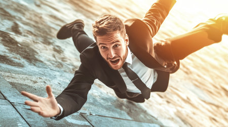 A businessman is captured in mid-air, falling from the sky with a vibrant office backdrop, featuring striking motion blur and a polished, realistic finish.
