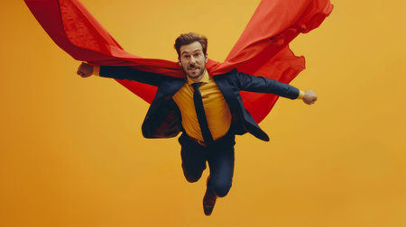 Dynamic superhero leaps forward on a yellow background, his red cape flowing dramatically behind him. The image conveys a sense of action and heroism
