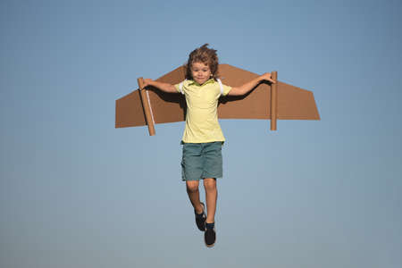 Kids fly. Funny child boy pilot flying with toy cardboard airplane wings on blue sky, copy space. Start up freedom concept, carefree kid.