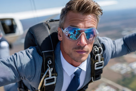 A man dressed in formal wear enjoys skydiving, showcasing his thrill and adventurous spirit in the sky.