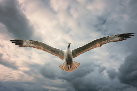 Single seagull flying in a cloudy sky as a background