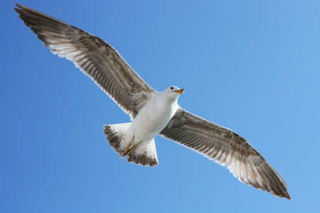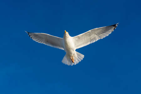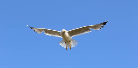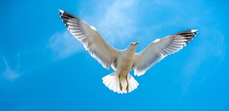 Seagull flying in clear blue sky at sunny summer day. Panoramic view.