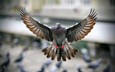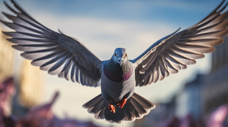 Pigeon flying in the air with its wings outspread.