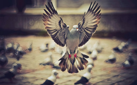 Pigeon flying in the air. Filtered image processed vintage effect.