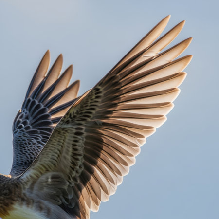 A stunning close-up captures the intricate feather details and broad span of a bird's wing as it gracefully soars through the air, showcasing natural beauty.