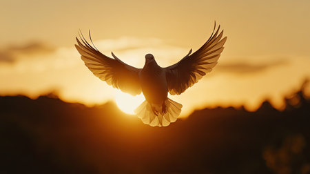 A white dove is captured mid-flight, wings spread wide, against a blurred backdrop of a setting sun. The image showcases warm, golden hues and highlights the bird with backlighting. The composition and lighting create a sense of freedom and serenity. Suitable for projects requiring imagery of wildlife, nature, or concepts of hope.