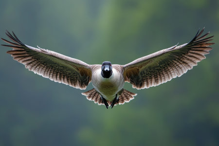 A majestic goose spreads its wings over a misty lake at dawn, capturing the serene beauty of wildlife in a tranquil setting with vibrant autumn colors.