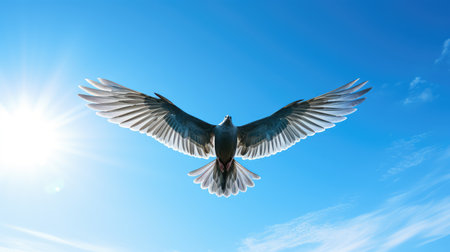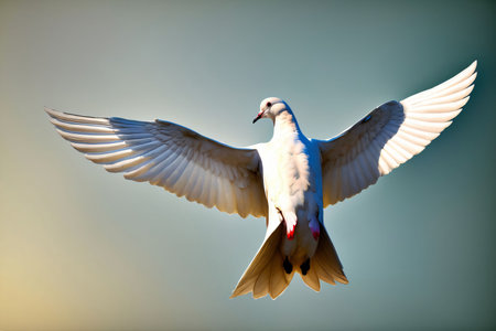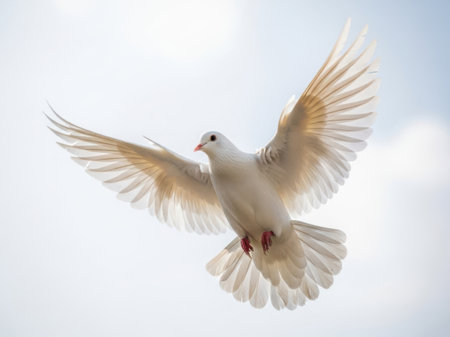White dove soaring gracefully against a serene blue sky, symbolizing peace, hope, and spirituality