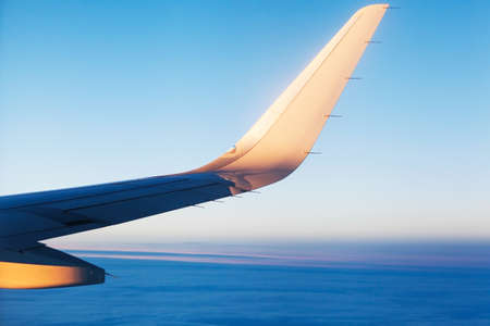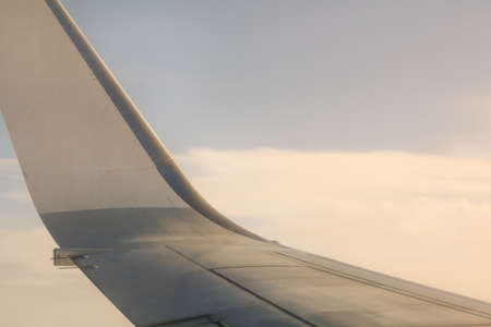 View from an airplane. Wing of passenger plane at sunset with cloudy sky. Concept, travel in times of covid