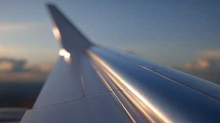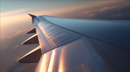 Airplane wing soaring through a serene sunset sky with warm golden light