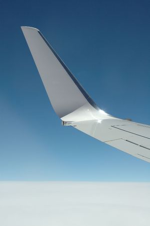 Beautiful view from the porthole on the wing of the plane and the clouds under it