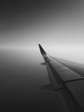 A single wing of an airplane. Background with copyspace. Travel concept. Generative AI.