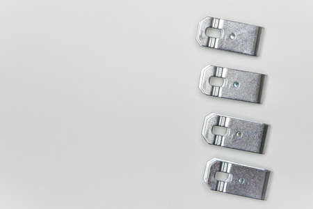 Repair kit for brakes, four metal plates - clips on the side. Set of spare parts for car brake repair. Details on white background, copy space available.