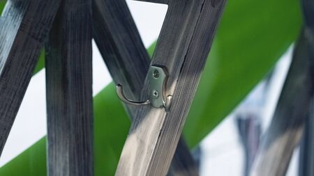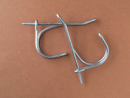 Hooks, drilled into the wall, drilled into the wood for hanging things, on the side there are anchors and many other types of hooks. The background is blurred, brown