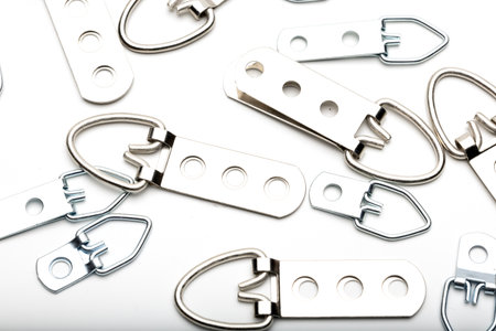 Metal fasteners and hooks scattered on a white surface. Various shapes and sizes are visible, showcasing their design and functionality for securing items.