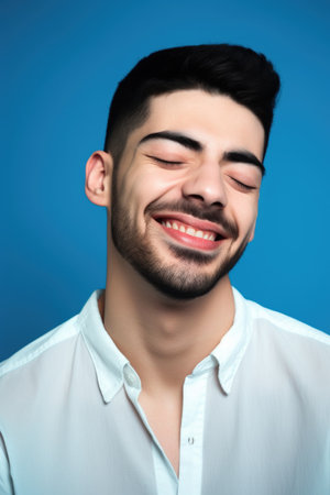 A close-up portrait shows a man with closed eyes, exhibiting a wide smile against a light blue backdrop. The image displays a man with dark hair, a beard, and a neutral-colored shirt. This image is suitable for various commercial uses, including advertising and editorial content.