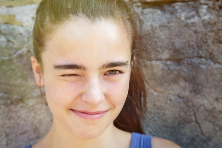 portrait of a smiling teenage girl squinting one eye