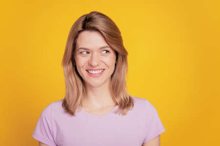 Portrait of positive cheerful curious lady look empty space shiny smile on yellow background
