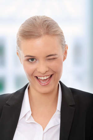 Businesswoman with big smile blinking.