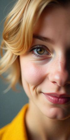 studio portrait close-up on one brown eye and expression, short layered blonde hair, light eyebrow detail, fair warm skin, yellow shirt edge.