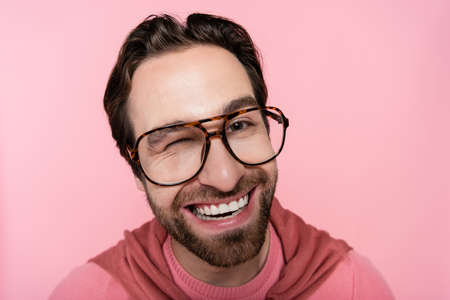Portrait of smiling man in eyeglasses winking at camera isolated on pink