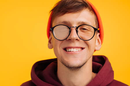 man has poor eyesight, a handsome guy in an orange hat and red light and glasses for sight, a fuzzy glass on his glasses, on a yellow background, positive and cheerful