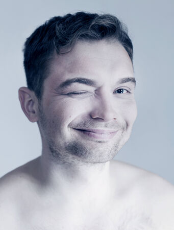 Young man making a funny silly face, sticking out his tongue and winking, expressing playful humor and carefree spirit.