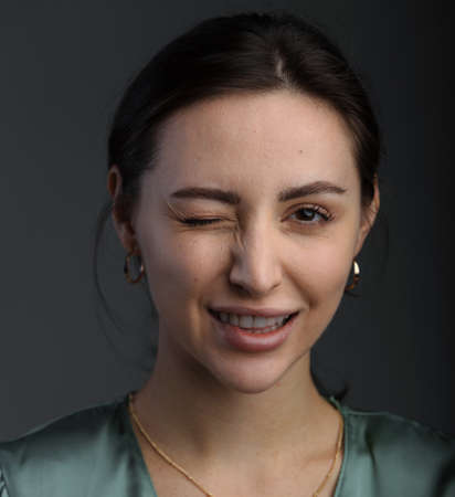 Portrait of playful and sweet young woman showing tongue giving wink, dressed in a green blouse isolated dark gray background, copy space
