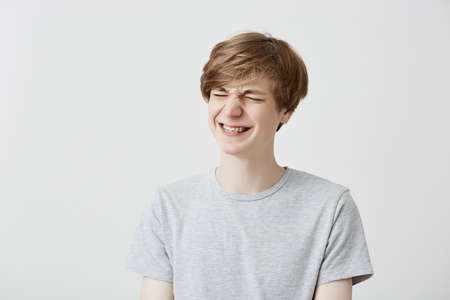 Cheerful caucasian young man grins at camera, has overjoyed expression, clenches teeth with braces, being glad. Smiling fair-haired stylish male in gray t-shirt expresses positiveness