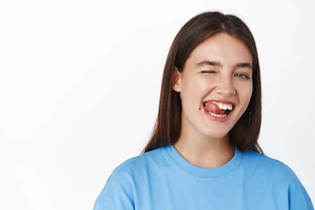 Close up portrait of smiling beautiful girl student, showing tongue, healthy teeth, winking happy at camera, white background